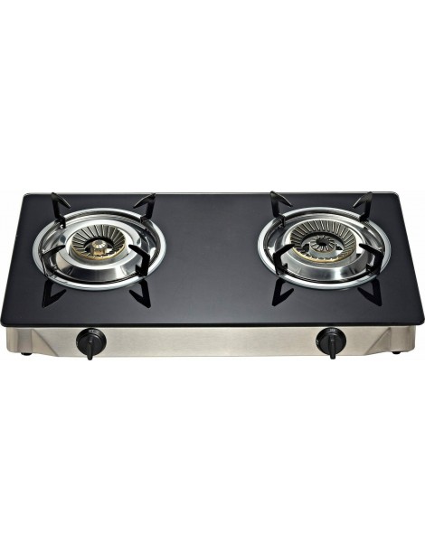 Γυάλινη επιτραπέζια συσκευή υγραερίου 2 εστιών, κατασκευασμένη από ανοξείδωτο χάλυβα (Inox), με κομψό σχεδιασμό, ανθεκτική και εύκολη στον καθαρισμό.